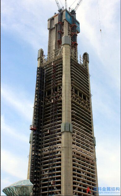 在大廈塔樓東側,一座200.94的“小鋼塔”——通道塔施工至39層,實現了與大廈同步長高。通道塔以鋼結構塔為附著載體和通道,用來完成超高層建筑施工中大量和繁重的垂直運輸任務。通道塔在超高層領域應用屬中國內地首例。