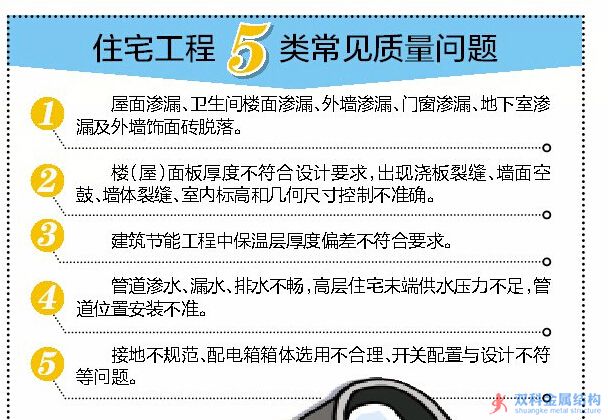 自治區(qū)住建廳下文,要求通過實(shí)地調(diào)查和問卷形式,關(guān)注居民房屋質(zhì)量問題 住建部門“問診” 看哪些房屋“帶病” ![]() 廣西新聞網(wǎng)-南國早報(bào)記者 徐慶成 房屋質(zhì)量問題,備受老百姓關(guān)注。4月21日,記者從自治區(qū)住建廳獲悉,該廳日前下發(fā)《關(guān)于開展2015年住宅工程質(zhì)量常見問題問卷調(diào)查工作的通知》,要求全區(qū)各市城鄉(xiāng)建委和房產(chǎn)主管部門通過實(shí)地調(diào)查和問卷,到居民區(qū)里開展住宅工程質(zhì)量常見問題治理 各地視情況選擇小區(qū)調(diào)查 近年來,廣西建設(shè)工程的總體水平逐年提高,但住宅常見質(zhì)量問題依然存在。記者從南寧市城鄉(xiāng)建設(shè)部門了解到,去年該市質(zhì)監(jiān)站收到的房屋質(zhì)量投訴中,關(guān)于滲漏和開裂的投訴,包括門窗、外墻、管道等屋內(nèi)設(shè)施滲漏及公共部分滲漏、墻面裂縫等,還有不少投訴涉及交房條件不符合要求等問題。 按照《通知》要求,各設(shè)區(qū)市、縣(市、區(qū))住房城鄉(xiāng)建設(shè)委(局)或房產(chǎn)主管部門,將選取2013年1月1日以后竣工驗(yàn)收的4~5個(gè)住宅小區(qū),采取實(shí)地調(diào)查和發(fā)放問卷方式進(jìn)行。選取的住宅小區(qū)將包含不同結(jié)構(gòu)類型,入住率在60%以上;設(shè)區(qū)市的每個(gè)住宅小區(qū)總戶數(shù)不宜少于300戶,縣(市、區(qū))每個(gè)住宅小區(qū)總戶數(shù)不宜少于100戶。當(dāng)轄區(qū)內(nèi)的住宅小區(qū)規(guī)模確實(shí)無法滿足上述要求時(shí),各地可視情況選擇適宜的小區(qū)開展問卷調(diào)查。 問卷在發(fā)放一周內(nèi)回收 自治區(qū)住房和城鄉(xiāng)建設(shè)廳有關(guān)負(fù)責(zé)人表示,房屋常見質(zhì)量問題受設(shè)計(jì)、建筑材料、施工管理、自然環(huán)境等多種因素影響,雖不影響主體結(jié)構(gòu)安全,但會(huì)影響到房屋外觀和正常使用功能。此次問卷調(diào)查,由住宅小區(qū)的物業(yè)(運(yùn)營)單位統(tǒng)一發(fā)放《住宅工程用戶滿意度問卷調(diào)查表》,發(fā)放后在一周內(nèi)回收。 各地住建、房管部門要向物業(yè)(運(yùn)營)單位詢問住戶反映的主要質(zhì)量問題,如外墻滲水、地下室滲水、廚衛(wèi)滲水、屋面滲水、窗臺(tái)或窗邊滲水、樓地面裂縫、給排水管道滲漏、開關(guān)插座接線錯(cuò)誤、室內(nèi)凈高不足等,對(duì)2014年接到的住宅工程用戶投訴進(jìn)行分類統(tǒng)計(jì)。并根據(jù)問卷統(tǒng)計(jì)情況,有選擇性入戶進(jìn)行實(shí)地調(diào)查。 業(yè)主收房時(shí)先進(jìn)行檢查 自治區(qū)住房和城鄉(xiāng)建設(shè)廳有關(guān)負(fù)責(zé)人表示,市民遇到住宅質(zhì)量方面的任何問題,都可以向廣西質(zhì)監(jiān)總站或者當(dāng)?shù)氐馁|(zhì)監(jiān)站咨詢或投訴。按照規(guī)定,房屋在竣工并經(jīng)相關(guān)部門驗(yàn)收合格后才能交付使用。購房者在收房和裝修時(shí),把好質(zhì)量關(guān)很重要。業(yè)主在收房時(shí),應(yīng)細(xì)心查看開發(fā)商必須提供的材料是否完善,確認(rèn)房屋具備交付條件。 住建部門提醒,為避免可能因裝修或后期施工破壞等導(dǎo)致的質(zhì)量問題責(zé)任界定不清,業(yè)主在收房時(shí)應(yīng)對(duì)住宅室內(nèi)觀感和使用功能方面質(zhì)量狀況進(jìn)行檢查,包括對(duì)衛(wèi)生間及其他有防水要求的房間地面進(jìn)行24小時(shí)蓄水試驗(yàn),檢查外墻、外窗、衛(wèi)生間、管道是否滲漏,房間空間尺寸和觀感是否符合要求等。此外,業(yè)主還應(yīng)依據(jù)購房合同,查驗(yàn)開發(fā)商是否實(shí)現(xiàn)對(duì)供水、供電、供熱、燃?xì)狻⑼ㄓ崱⒌缆贰⒕G化等配套設(shè)施的交付承諾。 住宅工程5類常見質(zhì)量問題 1 屋面滲漏、衛(wèi)生間樓面滲漏、外墻滲漏、門窗滲漏、地下室滲漏及外墻飾面磚脫落。 2 樓(屋)面板厚度不符合設(shè)計(jì)要求,出現(xiàn)澆板裂縫、墻面空鼓、墻體裂縫、室內(nèi)標(biāo)高和幾何尺寸控制不準(zhǔn)確。 3 建筑節(jié)能工程中保溫層厚度偏差不符合要求。 4 管道滲水、漏水、排水不暢,高層住宅末端供水壓力不足,管道位置安裝不準(zhǔn)。 5 接地不規(guī)范、配電箱箱體選用不合理、開關(guān)配置與設(shè)計(jì)不符等問題。 |